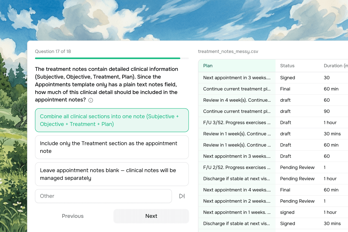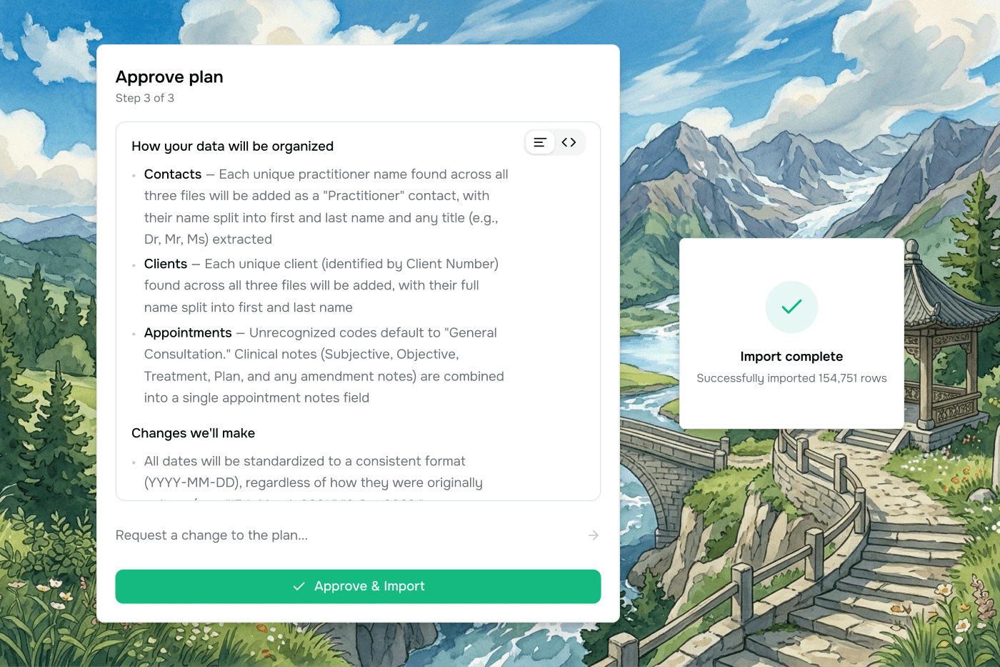 When Vern spots ambiguity in your data- mismatched values, unexpected column names, missing fields - it asks you targeted questions before doing anything. You answer once, and the import plan is built around your answers.